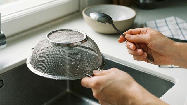 가장 대표적인 활용법은 '채반 세척'이다. 채반은 구조상 구멍이 많아 세제를 묻혀 닦다 보면 헹굴 때 물이 숭숭 빠져나가 여간 불편한 게 아니다. 거품은 남아 있는데 물은 제대로 닿지 않아 여러 번 헹구게 되는 경우도 흔하다. 이럴 때 채반을 한 손에 들고, 다른 손으로 숟가락을 뒤집어 볼록한 부분을 물줄기에 가져다 대보자. 물이 숟가락에 부딪히며 퍼져 흐르면서 채반 전체에 고르게 닿는다. 좁은 물줄기가 넓게 확산되기 때문에 거품을 한 번에 씻어내기 훨씬 수월하다. 이렇게 전반적인 거품기를 흘려보낸 뒤 마무리 세척을 하면 시간을 줄일 수 있겠다.