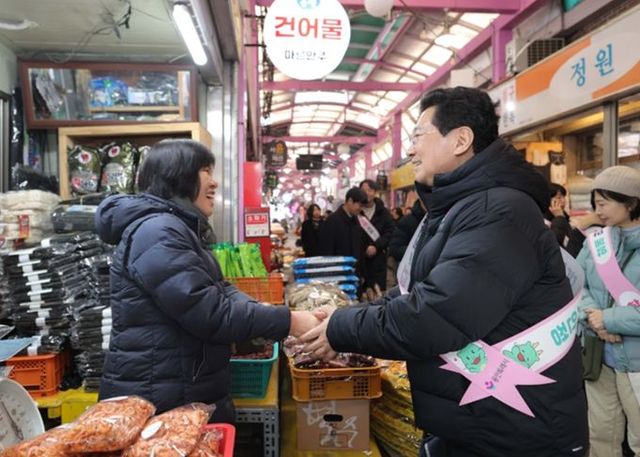 이 시장은 장을 본 뒤 상인회, 시민과 함께 ‘전통시장 이용 활성화와 물가 안정을 위한 캠페인’에 참여했다.