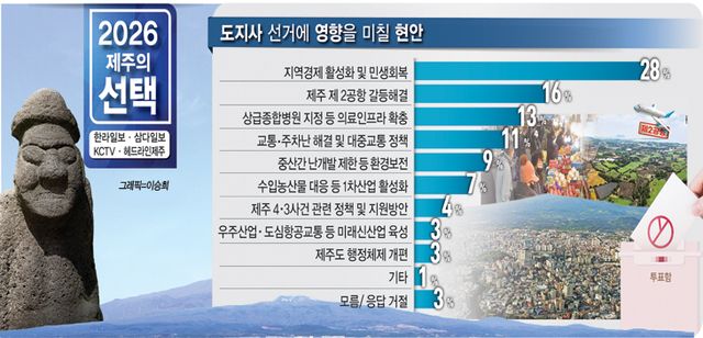 이번 제주도지사 선거에 영향을 미칠 가장 중요 현안이 무엇이라고 생각하는지 물은 결과 '지역 경제 활성화와 민생 경제 회복'을 꼽은 응답이 전체의 28%를 차지해 가장 많았다.