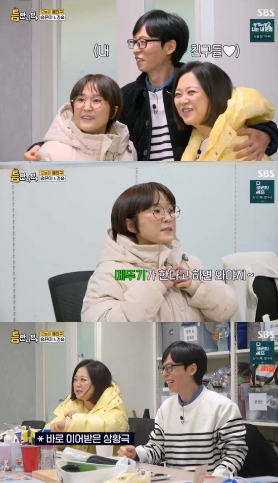 10일 방송된 SBS 예능 프로그램 '틈만 나면, 시즌4'에서는 '틈 친구'로 코미디언 송은이, 김숙이 출연해 유재석, 유연석과 함께 상암동을 찾아 '틈 주인'에게 행운을 선물했다.