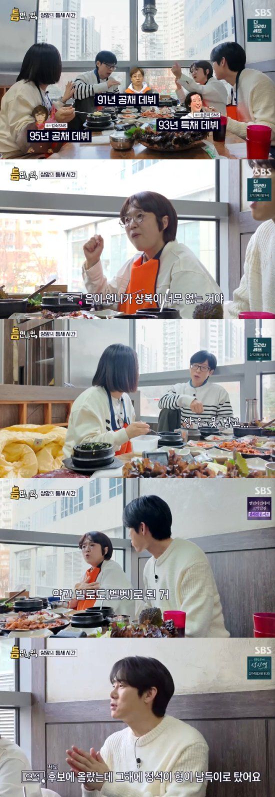 10일 방송된 SBS 예능 프로그램 '틈만 나면, 시즌4'에서는 '틈 친구'로 코미디언 송은이, 김숙이 출연해 유재석, 유연석과 함께 상암동을 찾아 '틈 주인'에게 행운을 선물했다.