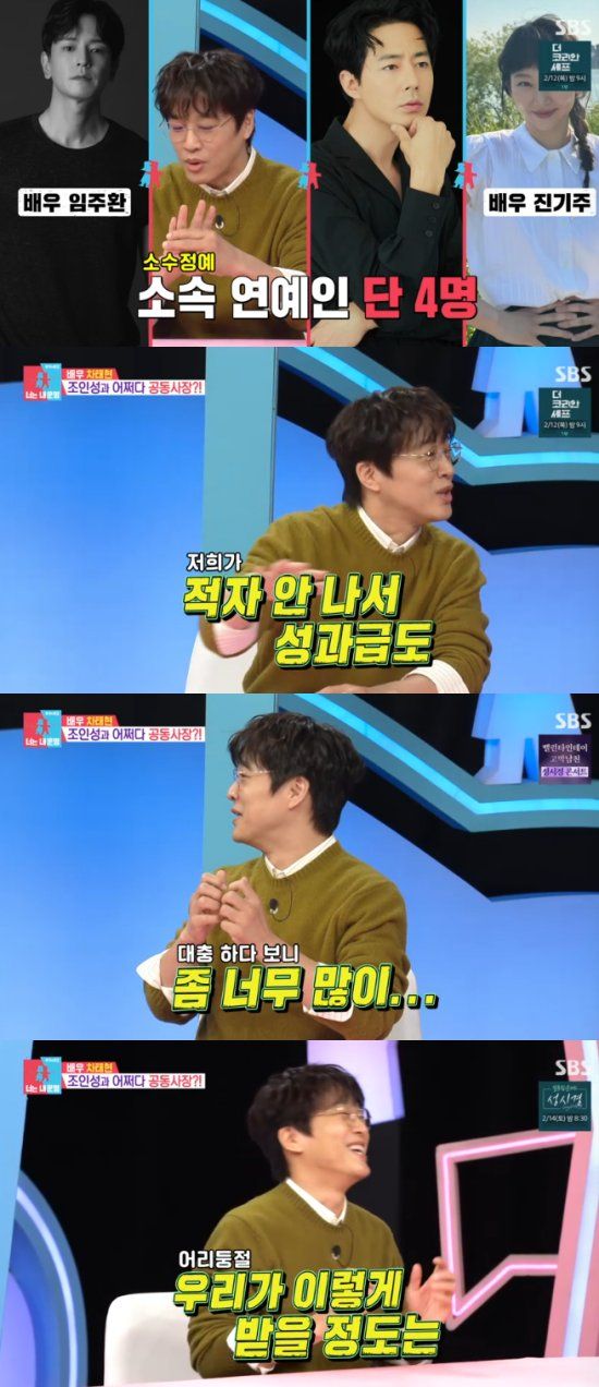 이날 차태현은 "조인성과 공동대표로 회사를 차렸다. 매니저 한 명씩 해서 작게 시작했다. 지금 임주환, 진기주까지 소속배우는 4명"이라고 했다.
