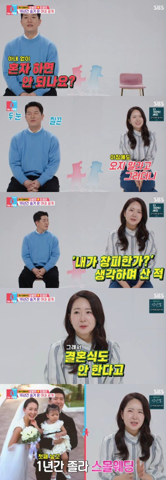 한경민은 "사람들 부르는게 싫다면서 결혼식 도 안하고 싶다고 하더라. 그래서 결혼식을 안하고 혼인신고만 했다가 첫째 딸을 낳은 후에 1년동안 졸라서 스몰웨딩을 했다. 그런데 결혼식 사진을 보면 썩은 미소다. 사진을 정말 급하게 찍었다"면서 씁쓸해했다.