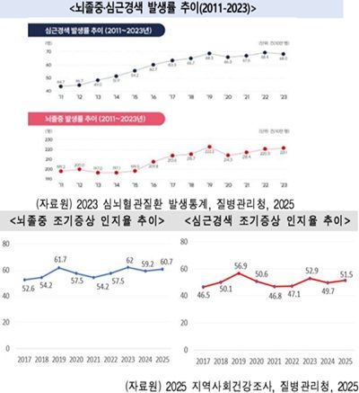 2025년 지역사회건강조사에 따르면 뇌졸중 조기증상 인지율은 60.7%, 심근경색 조기증상 인지율은 51.5%에 그쳤다.