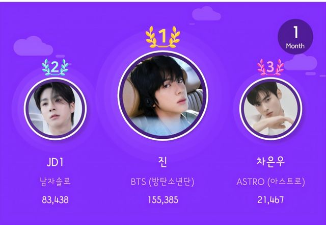 방탄소년단(BTS) 진은 글로벌 팬덤 플랫폼 스타플래닛에서 진행된 ‘1월 아이돌 랭킹’에서 압도적인 표 차이로 1위를 차지했다. 투표는 1월 1일부터 25일까지 진행됐으며, 진은 총 15만5385표를 얻어 최상단에 이름을 올렸다. 해당 랭킹에서 지난해 9개월 연속 1위를 기록한 데 이어 다시 한 번 정상을 차지하며 꾸준한 팬덤 영향력을 확인시켰다.