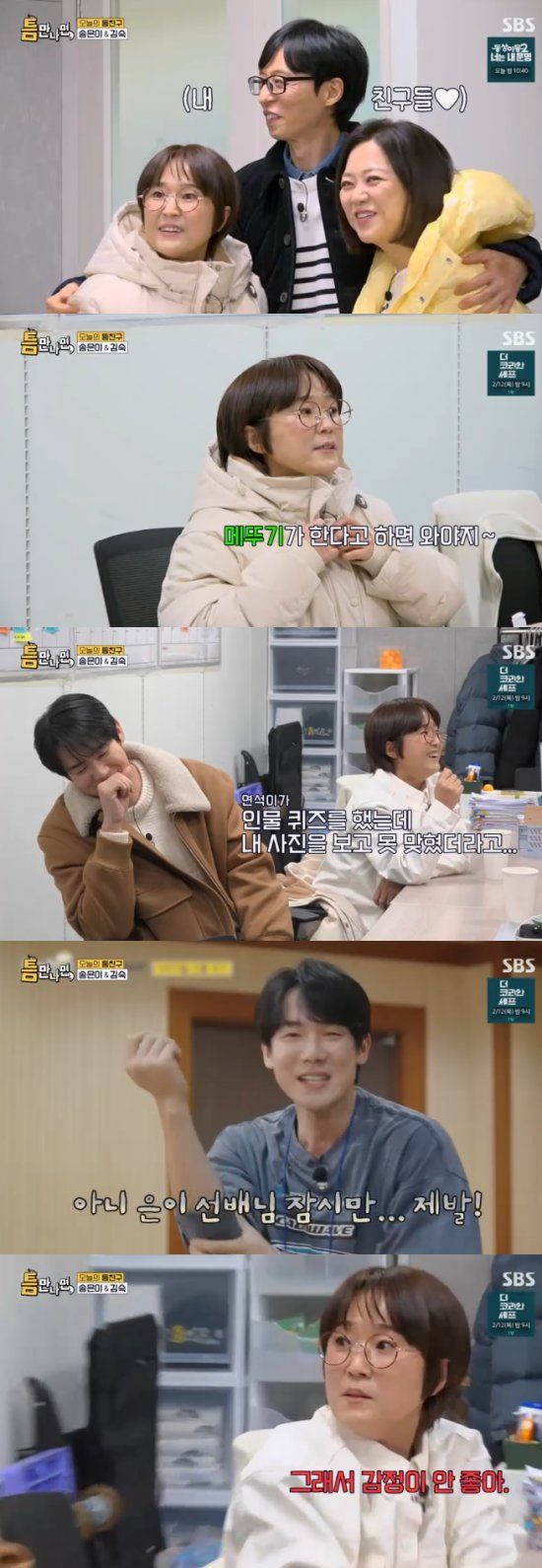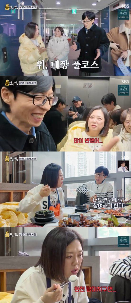지난 10일 방송된 SBS 예능 프로그램 '틈만 나면, 시즌4'에서는 '틈 친구'로 코미디언 송은이, 김숙이 출연해 유재석, 유연석과 함께 상암동을 찾아 '틈 주인'에게 행운을 선물했다.