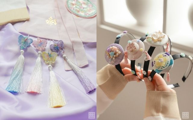 명절 분위기를 더할 전통 액세서리도 준비됐다. 나비 태슬 장식은 파스텔톤 자수와 태슬이 어우러진 디자인으로 한복과 잘 어울리며 가방이나 파우치에 달아 포인트 소품으로 활용할 수 있다. 전통꽃 머리띠와 가체 머리띠는 착용이 간편해 명절 차림에 포인트를 더하거나 가족 사진 촬영용 아이템으로 제격이다.