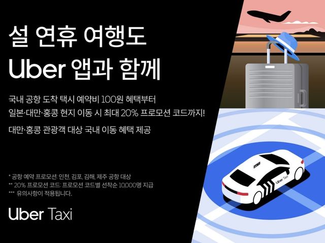 아울러 설 연휴 기간 공항 이용객 증가에 대비해, 공항으로 이동하는 승객의 편의성을 높이기 위한 공항행 택시 100원 예약 프로모션을 지난해에 이어 올해도 운영한다. 혜택은 목적지가 인천·김포·김해·제주공항일 경우 자동 적용된다. 우버 앱에서 ‘예약’을 선택한 후 탑승 위치, 도착지, 픽업 시간을 입력하면 간편하게 예약할 수 있어, 이용자는 예약 비용 부담을 크게 줄이고 여행 일정을 보다 합리적이고 효율적으로 관리할 수 있다.