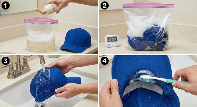 AI툴로 생성한 캡모자 세척 순서 자료사진. 지퍼백 안에 따뜻한 물을 반 이상 채운다. 샴푸를 2~3펌프 넣어준다. 지퍼백을 충분히 흔들어 거품을 내고 30분 기다린다. 물로 모자를 세척한다. 오염이 심한 곳은 클렌징폼을 묻힌 칫솔로 닦아준다.