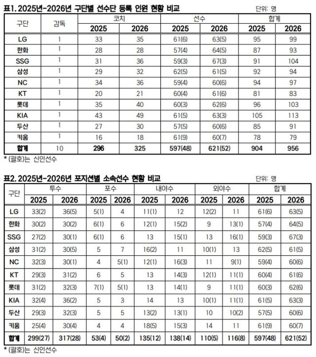 한편 2026시즌 10개 구단 소속 선수는 전년 대비 24명 늘어난 621명으로 집계됐다. 10개 구단 중 가장 많은 선수를 등록한 구단은 SSG 랜더스로 총 67명이었다. 이어 한화 이글스가 64명, LG 트윈스·KIA가 63명, 롯데 자이언츠가 62명, 삼성 라이온즈·KT가 61명, NC 다이노스·두산 베어스·키움이 가장 적은 60명의 선수를 등록했다. 10개 구단이 모두 등록 선수 60명을 넘긴 것은 이번이 처음이다.