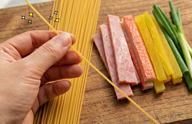 가장 많이 쓰이는 방법은 마른 파스타면(스파게티면)을 꼬치처럼 활용하는 것이다. 스파게티 면을 이쑤시개 길이인 약 6cm 정도로 잘라 준비한다. 햄, 맛살, 단무지, 쪽파 등을 오색으로 맞춰 꽂고, 양쪽 끝이 2~3mm 정도만 나오게 정리하면 외형도 깔끔하다. 끝이 길게 남으면 가위로 잘라 단정하게 다듬는다.