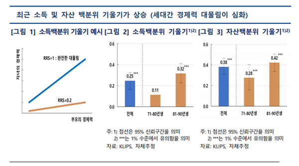 보고서는 부모와 자녀의 소득 순위를 비교해 대물림 정도를 측정하는 소득백분위 기울기(RRS)를 0.25로 추정했다. 이는 부모의 소득 순위가 10계단 오를 경우 자녀의 소득 순위도 평균 2.5계단 상승한다는 의미다.
