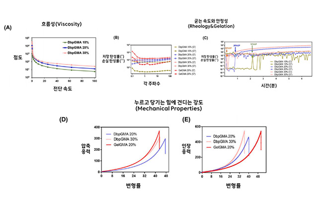 - ▲ DbpGMA 바이오잉크의 물리적 특성 분석 결과. (A) 모든 농도에서 힘이 가해질수록 점도가 낮아지는 전단 감소(shear-thinning) 현상이 나타났다. (B, C) 농도에 따라 점탄성 특성을 보였으며, 농도가 높을수록 굳는 속도가 빨라지는 경향이 확인됐다. 다만 농도가 지나치게 높을 경우 세포 적합성에는 제한이 있었다. (D, E) 농도가 높을수록 강도는 증가했으나 유연성은 감소했다. 연구팀은 20% 농도에서 구조 안정성과 유연성의 균형이 가장 적절했다고 설명했다. /이미지=한림대학교춘천성심병원