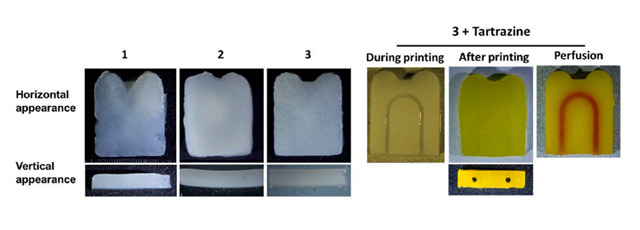 또한 연구팀은 타트라진 색소 0.1%를 첨가해 도관 구조를 포함한 3D 구조체를 구현했다. 지름 0.7mm 규모의 미세 통로를 제작하고 염료 흐름을 확인함으로써, 향후 혈관 구조를 모사하는 연구에 활용될 수 있는 구조적 기반을 제시했다.
