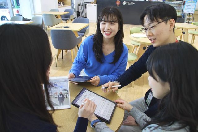 티웨이항공 임직원들이 사내 항공안전보안 매거진 안전마진을 읽으며 의견을 나누고 있다. ⓒ 티웨이항공