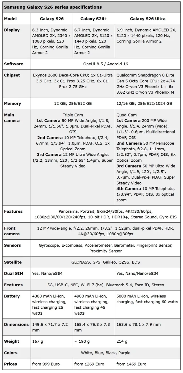 갤럭시S26 시리즈 전체 상세 스펙이 나왔습니다.