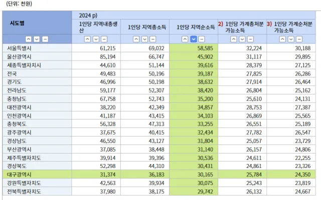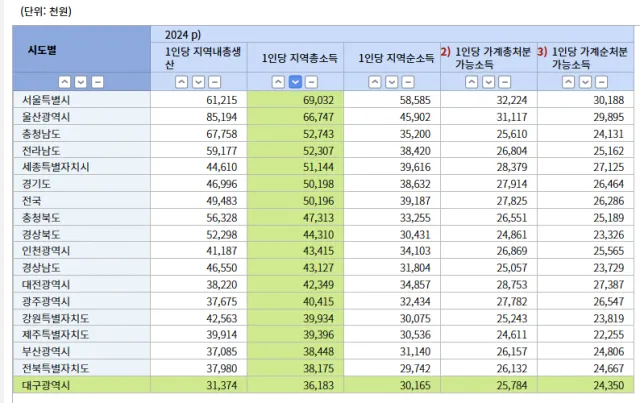 1인당 지역내총생산 모든 광역자치단체 중에 꼴찌