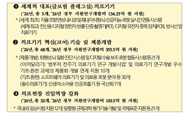 또한, 정부는 관계부처 합동으로 의료기기 분야 산·학·연·병 연구자 대상의 ‘2026년도 범부처 첨단 의료기기 연구 개발사업 신규 지원 재상 과제 사업설명회’를 2월 13일 10시부터 13시까지 엘타워 그레이스 Ⅰ홀 (서울 서초구)에서 개최한다.
