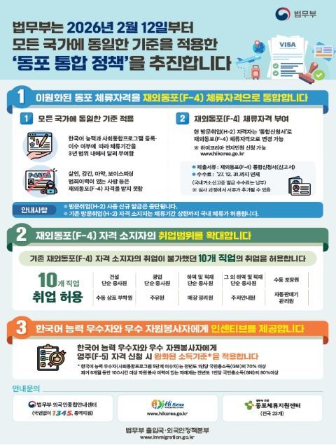 [와이뉴스] 법무부는 2026년 2월 12일 국내․외 체류 동포 사회의 오랜 숙원이었던 '동포 체류자격(F-4) 통합' 조치를 시행한다고 밝혔다.