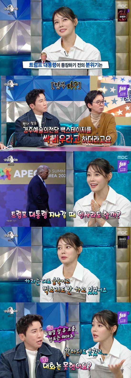안현모는 "경주 예술의 전당 백스테이지를 싹 비우라고 지시를 해놨더라. 저는 진행자니까 저만 빼고 모두가 나갔다. (트럼프 대통령에게) 말을 걸고 싶었는데, 그렇게 안되더라"고 했다.