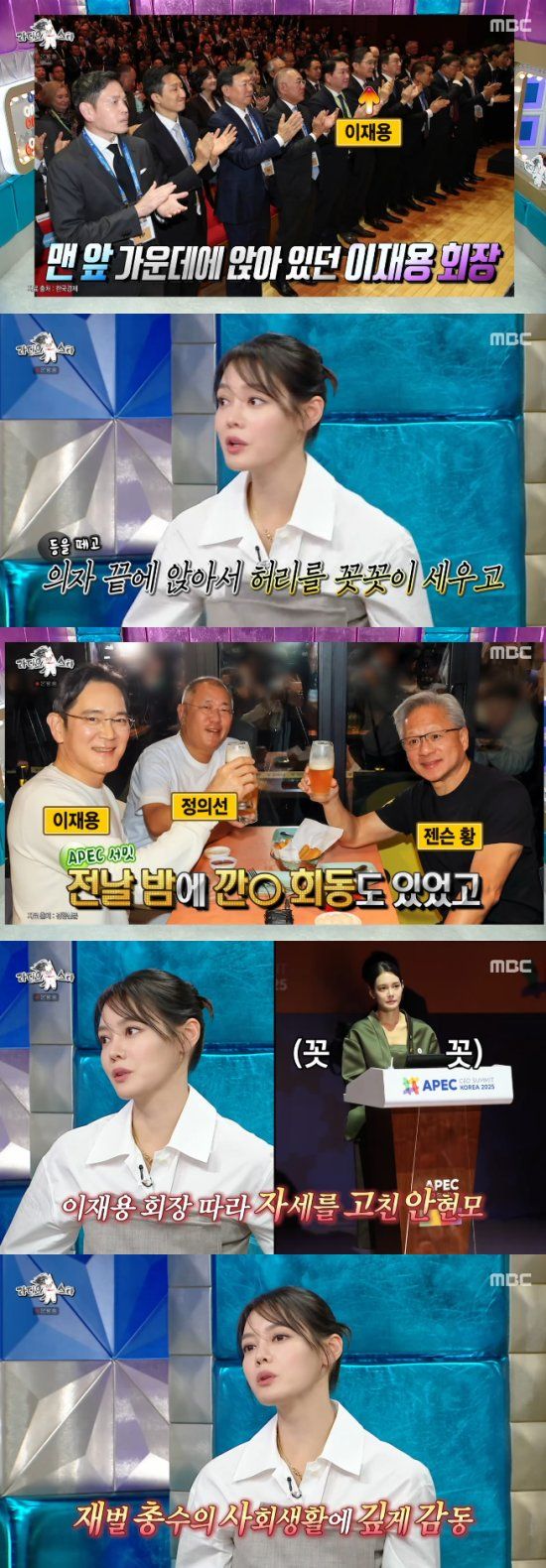 또 안현모는 이재용 회상을 보고 교훈을 얻었다면서 "APEC CEO 서밋 개회식에서 총수들 중에 이재용 회장님이 센터에 계셨다. 대통령께서 연설을 하시는데, 혼자만 등을 기대지 않고 허리를 세우고 앉아 계시더라"고 했다.