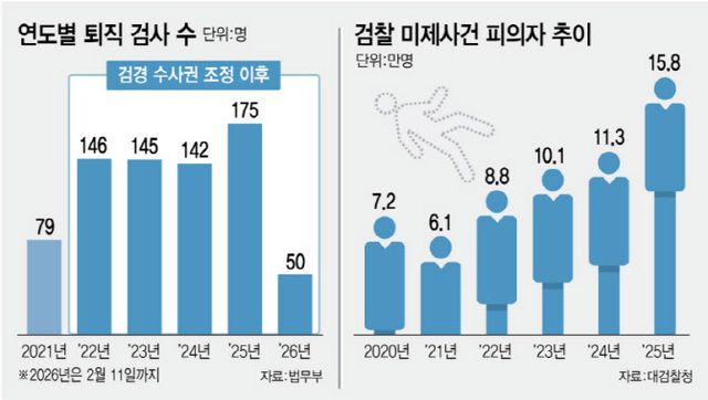 검찰 관계자는 “경력 있는 허리급이 빠지고 저연차 검사들이 그 자리를 메우고 있는데 사건의 양과 난이도는 오히려 올라갔다”며 “검찰청 기능 개편을 이유로 오히려 정원을 줄이는 게 정부 기조다 보니 상황은 갑갑하고 피해는 결국 사건 처리를 기다리는 국민에 돌아가고 있다”고 지적했다.