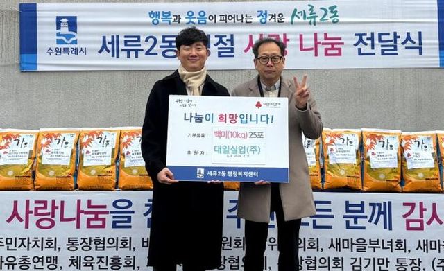 변영호 세류2동장은 “매년 사랑 나눔을 실천을 해주신 대일실업(주)에 감사드리며, 앞으로도 민·관 협력을 통해 행복과 웃음이 피어나는 정겨운 세류2동을 만들기 위해 최선을 다하겠다”라고 말했다.