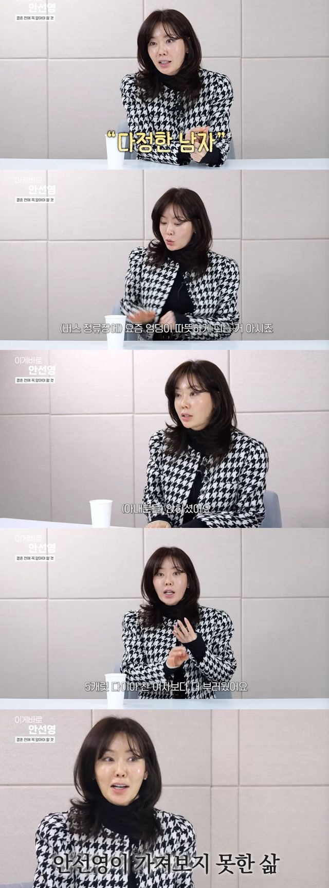 안선영은 "얼마 전 아름다운 광경을 봤다. 노부부가 있는데 남편이 따뜻한 버스정류장 의자에 아내를 불러서 앉혔다. 그리고 버스가 와서 기다릴 때 바람이 부니 호주머니에 아내의 손을 넣더라"며 "그 아내 분이 비싼차 타고 5캐럿 다이아 찬 여자보다 더 부러웠다. 제가 가져보지 못한 삶이다"라고 고백해 눈길을 끌었다.