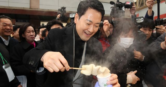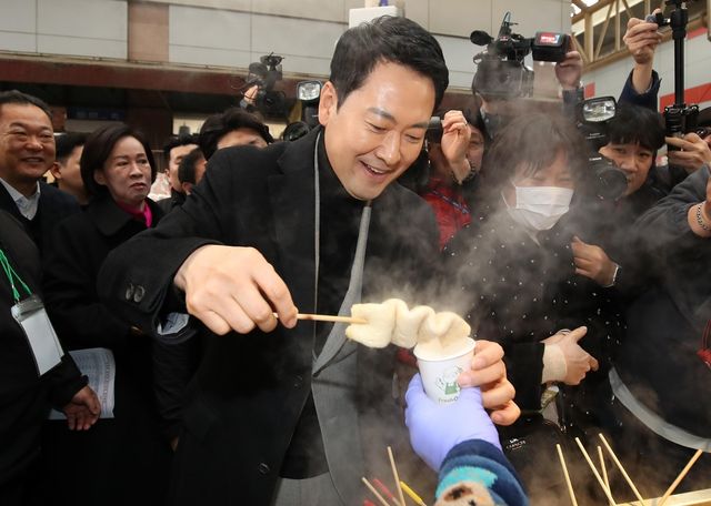 장동혁 국민의힘 대표가 11일 오전 대구 서문시장의 어묵가게에서 어묵을 맛보고 있다. / 뉴스1