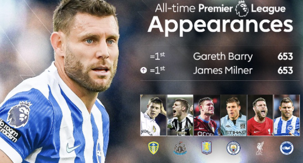 밀너는 준수한 기본기와 왕성한 활동량으로 PL에서 꾸준하게 사랑받으며 최다 출장 기록까지 가닿았다. 어린 시절부터 뛰어나 잉글랜드 U21 경기만 46경기 소화했고, 대표팀으로도 61경기를 소화했다. 재능에 노력이 결부된 밀너는 이제 아무도 가본 적 없는 경지에 도전한다. 밀너는 40세 이후에 PL 경기에 나선 다섯 번째 필드 플레이어다. 이전에는 고든 스트라칸, 테디 셰링엄, 케빈 필립스, 긱스가 불혹까지 PL을 누볐다. 이 중 최고령 출전은 2006년 12월 40세 272일 나이로 경기를 뛴 셰링엄이 갖고 있다. 밀너가 다음 시즌까지 뛰어야 넘어설 수 있다.