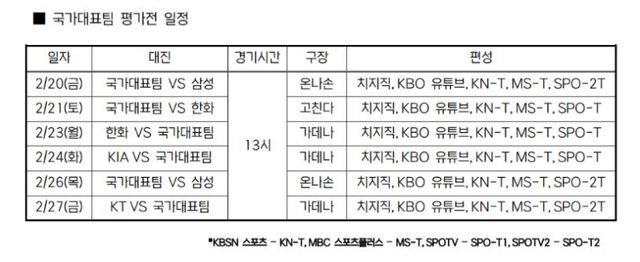 한국야구위원회(KBO)는 '3월에 열리는 2026 월드베이스볼클래식(WBC)에 대비해 일본 오키나와에 훈련 캠프를 차리는 야구 국가대표팀의 평가전 일정과 중계가 확정됐다'고 12일 밝혔다.