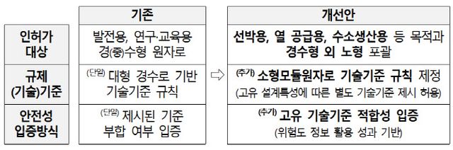 원안위는 이번 로드맵에 따라 오는 2030년까지 향후 5년간 기존 대형원전 기반의 안전규제체계를 단계적으로 개편한다. 우선 발전용·연구용·교육용 원자로로 규정된 기존 인허가 체계를 선박용, 열 공급용, 수소 생산용 등 다양한 목적과 설계를 포괄하도록 확대 개편한다.
