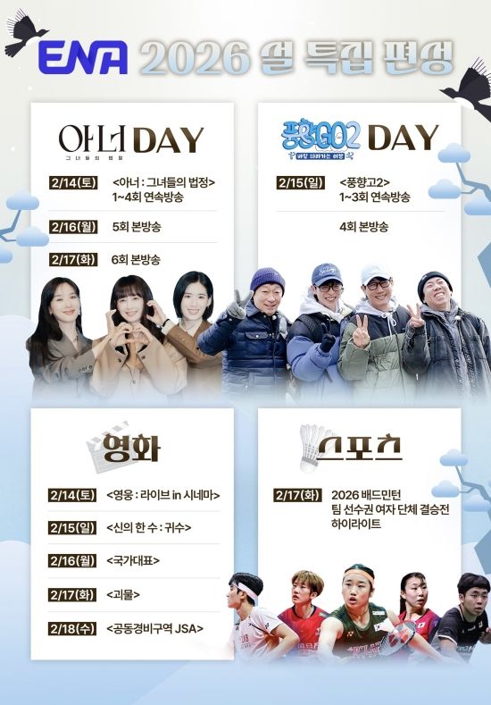 엑스포츠뉴스 황수연 기자) ENA가 설 명절을 맞아 예능, 드라마 화제작은 물론 스포츠, 특선 영화까지 아우르는 특별 편성을 선보인다. 이와 함께 설 연휴 이후 공개될 상반기 드라마·예능 라인업도 예고하며 시청자들의 기대를 높이고 있다.