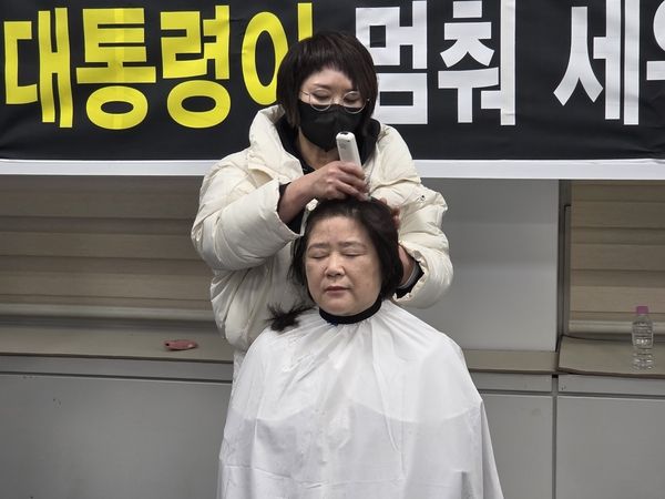 ▲ 안경자 대전시의원이 대전시와 충남도의 행정통합 전면 중단을 촉구하며 삭발하고 있다.