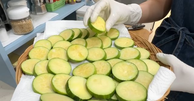 냉장 숙성을 마친 애호박은 따로 물에 헹구지 않는다. 키친타월로 겉면의 물기만 가볍게 눌러 제거한다. 이미 소금으로 밑작업이 되어 있기 때문에 추가 간은 거의 필요 없다. 이 상태에서 바로 부침을 준비하면 된다.