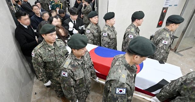 12일 오전 경기 성남시 분당구 국군수도병원 장례식장에서 코브라 헬기 추락으로 순직한 故 장희성·정상근 준위 영결식에서 정상근 준위의 영정과 관이 운구되고 있다. / 뉴스1