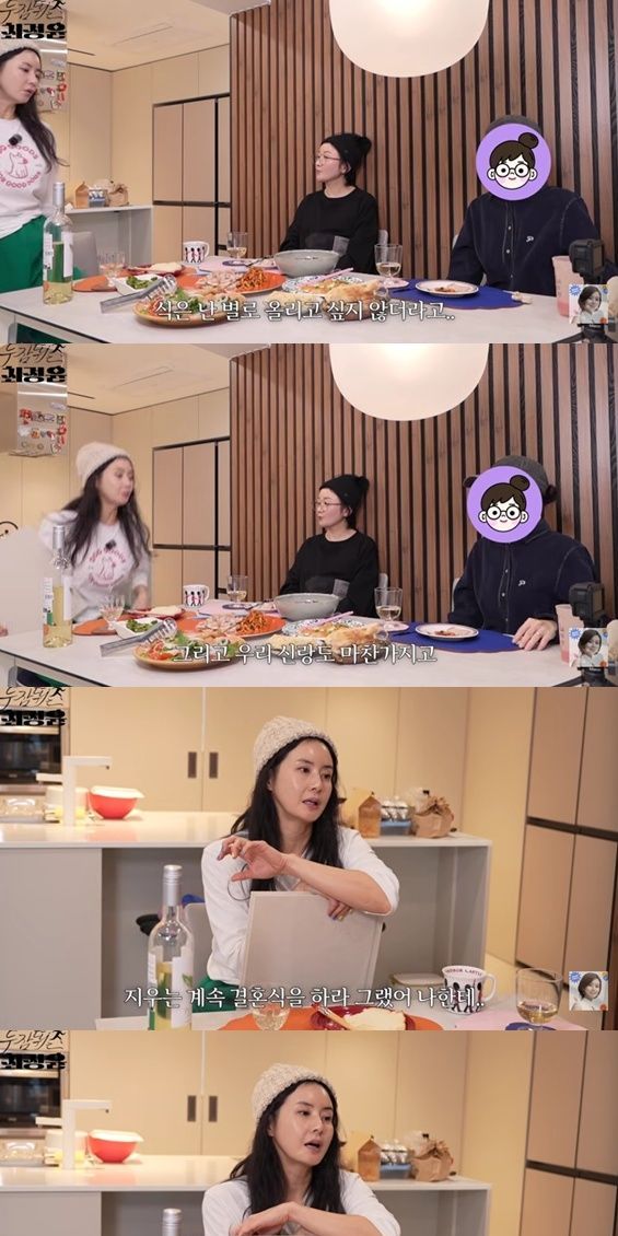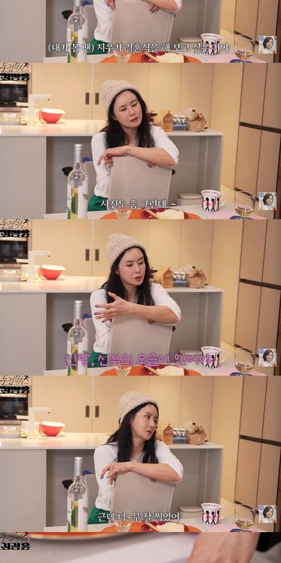 최정윤은 "결혼식은 올리고 싶지 않았다. 우리 신랑도 마찬가지다. 지우는 계속 결혼식을 하라고 했다. 자기가 해 보고 싶은 거다. 엄마가 하고 싶지 않다고 해서 포기했는데 어느날 갑자기 사진이라도 찍자고 하더라. 사진도 좀 그랬는데 지우가 진심으로 어필하길래 찍었다. 너무 잘 찍었다. 지우가 너무 좋아하더라. 나는 어쨌든 두 번째 찍는 건데 지금이 훨씬 예쁘다고 한다. 49세에 찍은 건데도 그렇다"라며 너스레를 떨었다.