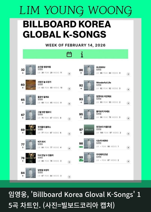 가수 임영웅이 2월 2주차 빌보드가 지원하는 글로벌 K-뮤직 차트 ‘Billboard Korea Global K-Songs’와 국내 중심 차트 ‘Billboard Korea Hot 100’에서 나란히 존재감을 드러냈다. 두 차트에서 각각 톱100에 15곡을 올리며 11주 연속 다수 곡 동시 진입을 이어갔다.