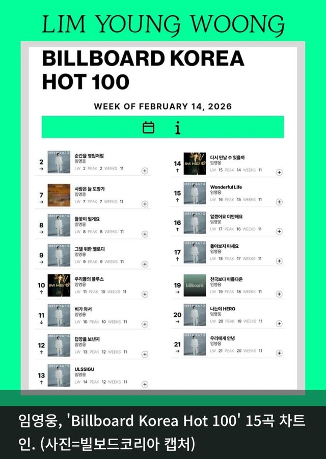 이번 집계에서 임영웅은 ‘Billboard Korea Hot 100’에 11주 연속 15곡을 진입시켰다.