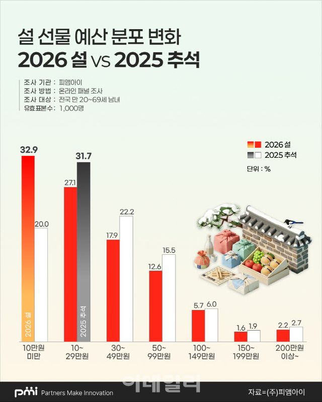 소비자들은 가장 먼저 ‘명절 선물 지출’(32.6%)과 ‘여행·외식’(29.0%) 비용을 줄였다. 차례상을 간소화(25.9%)하겠다는 움직임도 뚜렷하다. 선물 트렌드는 ‘가성비’와 ‘실용성’으로 귀결됐다. 주고 싶은 선물과 받고 싶은 선물 모두 ‘현금 및 상품권’이 압도적 1위(각각 52.0%, 63.3%)를 차지했으며, 선물 예산은 ‘10만 원 미만’이 32.9%로 가장 높은 비중을 보였다.