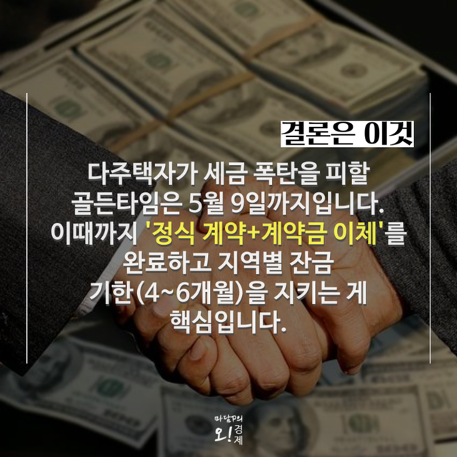 다만 시장 충격을 완화하기 위해 5월 9일까지 매매계약을 체결하고 계약금을 지급한 경우에 한해 중과 배제 혜택을 인정하기로 했다.