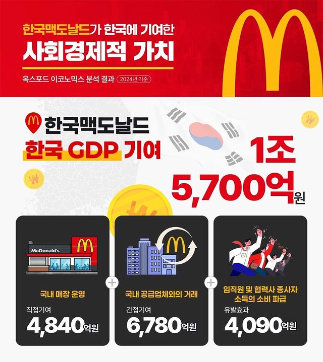 맥도날드가 2024년 한 해 동안 한국 내 비즈니스를 통해 한국 GDP에 약 1조 5,700억 원에 달하는 기여를 한 것으로 분석됐다. 연간 고용 창출 효과는 3만 5000명에 달하는 것으로 나타났다.