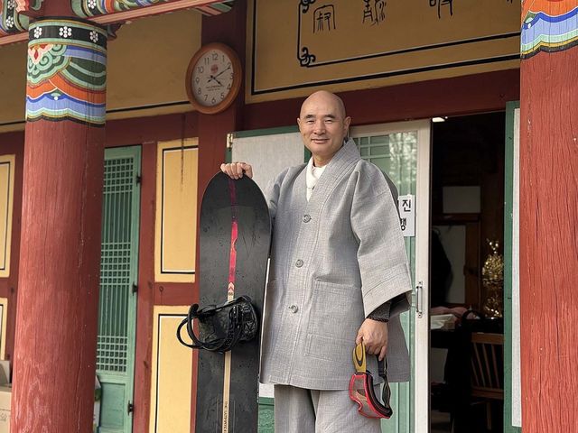 경기도 남양주 봉선사 주지 호산스님이 12일 인터뷰 후 보드를 들고 포즈를 취하고 있다. 호산스님을 중심으로 불교계는 2003년부터 20년 넘게 '달마배 스노보드 대회'를 개최해 김상겸, 유승은 등 한국 동계올림픽 선수들을 후원해왔다. / 연합뉴스