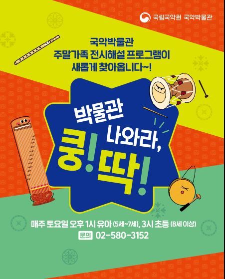 먼저 2026년 개편된 <박물관 나와라, 쿵딱!>은 국악박물관을 대표하는 주말 상설 프로그램으로 보호자와 아동이 함께 참여하는 체험형 전시해설 프로그램이다.