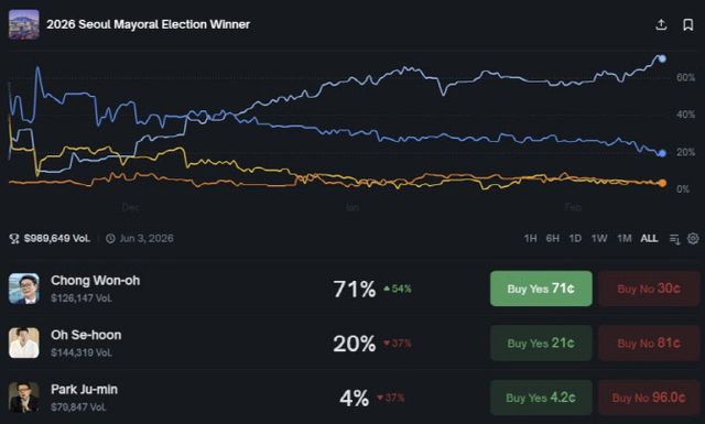 당초 폴리마켓은 지난해 12월 초순까지 현직인 오 시장의 당선 가능성을 가장 높게 봤다. 그러나 이 대통령이 정 구청장을 직접 칭찬한 이후로 전세가 역전된 뒤 이 흐름이 이어지고 있다.