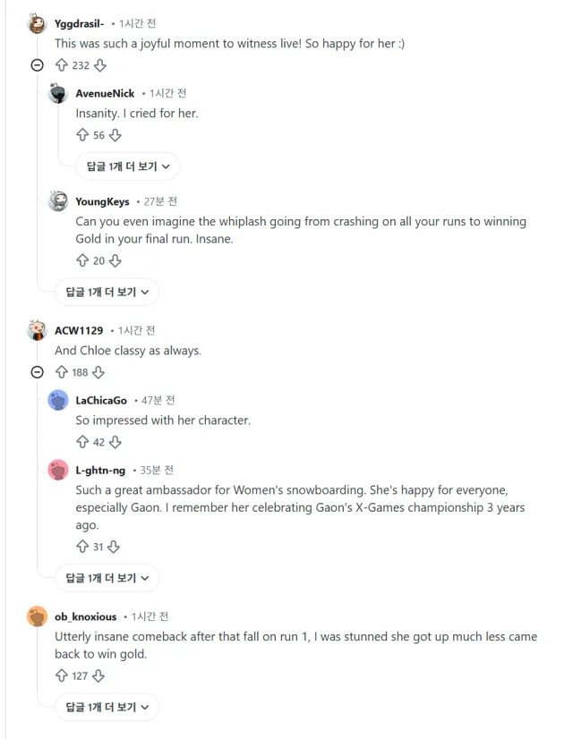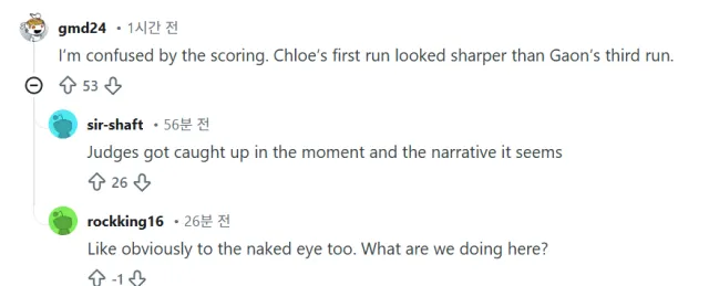 “채점이 좀 이해가 안 되네요. 클로이의 1차 런이 가온의 3차 런보다 더 깔끔해 보였어요.”