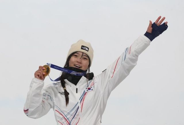 12일(현지시간) 이탈리아 리비뇨 스노파크에서 열린 2026 밀라노-코르티나담페초 동계올림픽 스노보드 여자 하프파이프 결승에서 우승한 최가온. © 연합뉴스