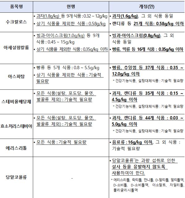개정안에 담긴 식품유형별 감미료 사용량은 아래와 같다.