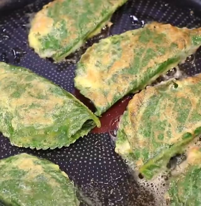 프라이팬에 식용유를 넉넉하게 두른 후 중약불에 노릇하게 구워주면 맛있는 깻잎전 완성이다.