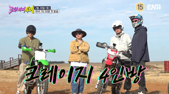 28일 오후 7시 50분 첫 방송하는 ENA 새 예능 ‘크레이지 투어’는 도파민과 스릴에 굶주린 비(정지훈) 김무열 빠니보틀 이승훈(WINNER)이 전 세계 곳곳에 숨어 있는 ‘크레이지’한 도전을 찾아 떠나는 여행 예능이다. 관광과 힐링 대신 극한 미션으로 채워진 여정 속 네 사람의 예측 불가한 케미가 관전 포인트다. 제작진은 첫 방송을 앞두고 2차 티저 영상을 공개했다.